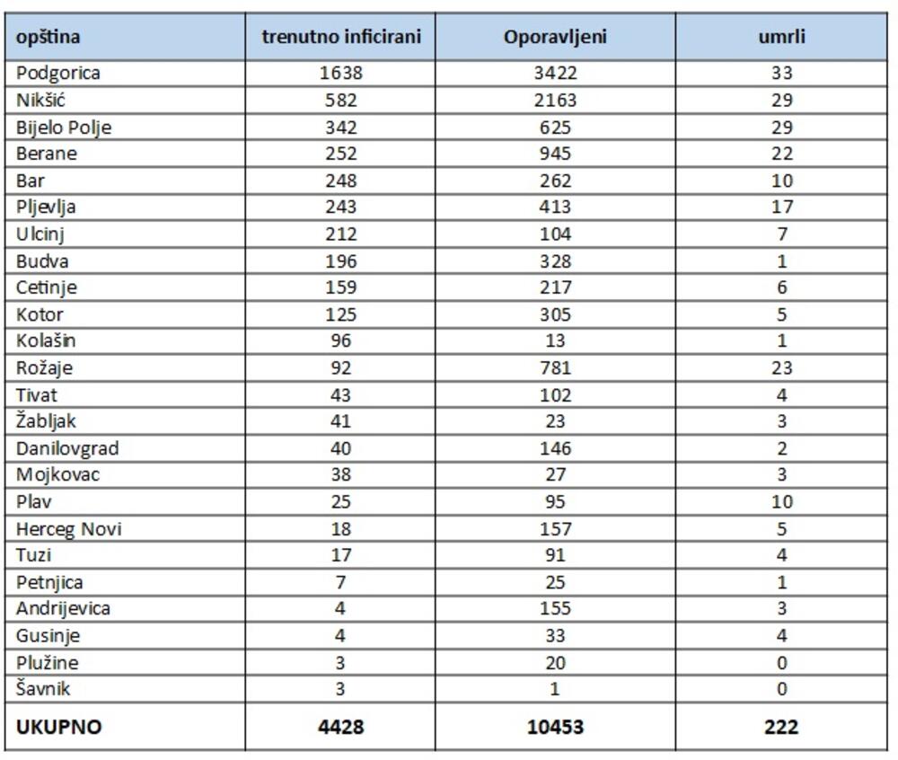 Uzimajući u obzir sve novootkrivene slučajeve kao i broj oporavljenih u protekla 24 časa, ukupan broj trenutno aktivnih slučajeva COVID19 u Crnoj Gori iznosi 4428.